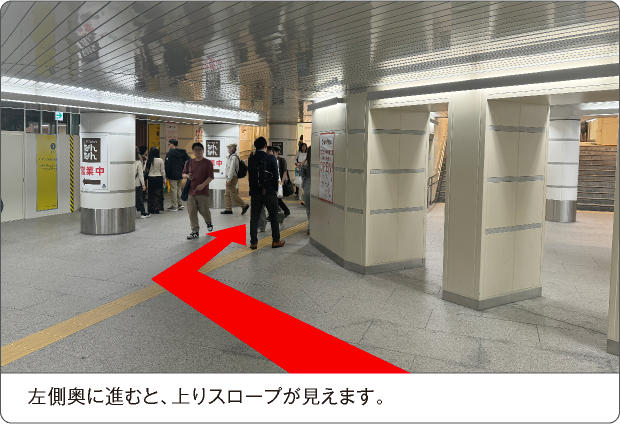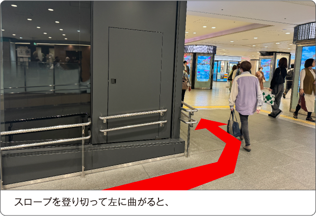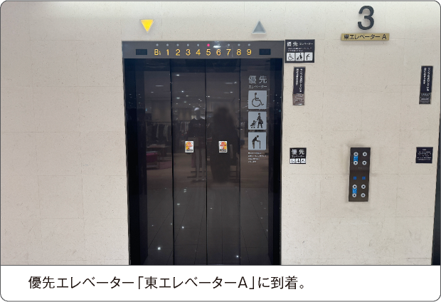 下りスロープを約10m直進いただくと、左手すぐに優先エレベーター「東エレベーターA」がございます。