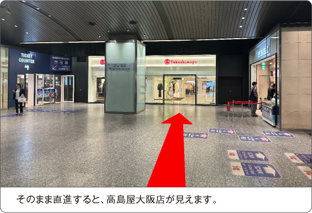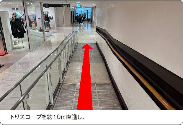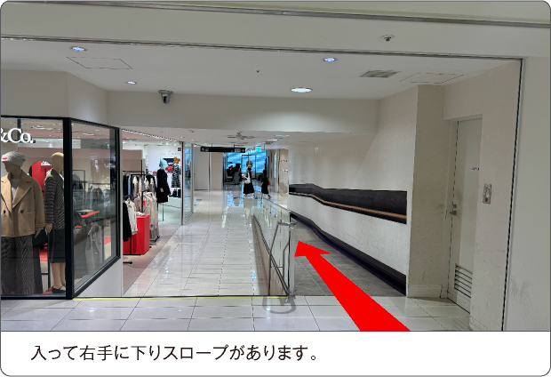 左側にある上りスロープを20m直進、左手すぐに高島屋大阪店地下1階 優先エレベーター「西エレベーターA」がございます。